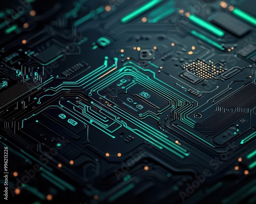 Abstract circuitry forming a simple pattern on a matte background, subtle glow from blue and green LEDs, minimal style