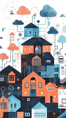 Abstract Cityscape: Connected Houses and Geometric Patterns
