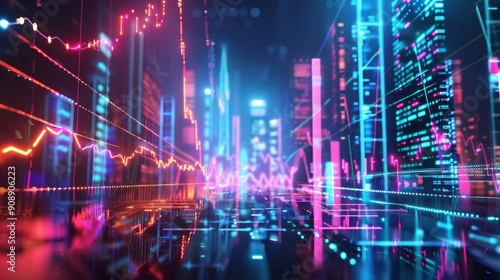 Abstract Cityscape with Neon Lights and Data Patterns