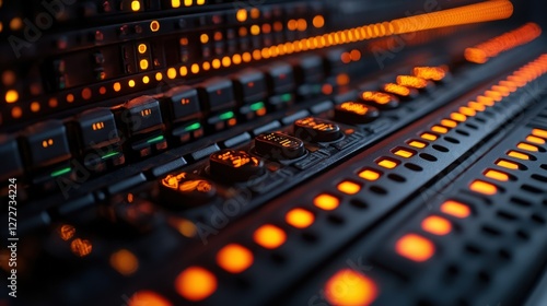 Abstract Close-Up of Audio Mixer with Illuminated Control Panels