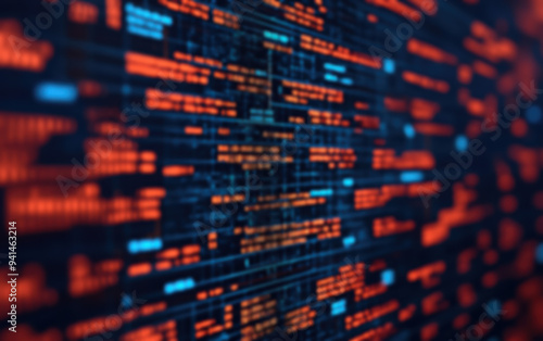 Abstract close-up of glowing red and blue code on a dark background representing cyber security, programming, and technology concepts.