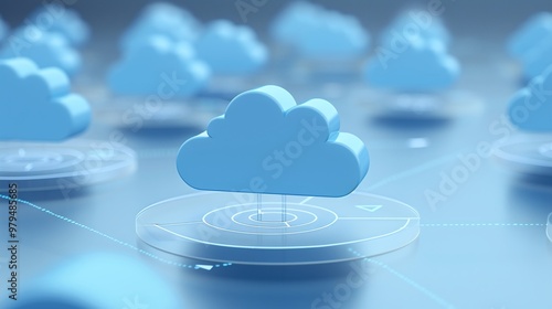 Abstract cloud computing concept with blue clouds on digital platforms, symbolizing data storage and technology connectivity.
