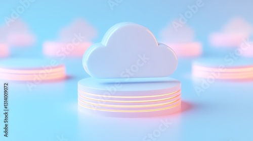Abstract Cloud Computing Concept with Bright Neon Circles on Soft Blue Background