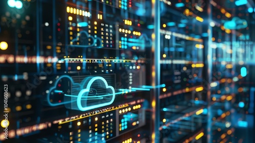 Abstract cloud computing concept with server room background.