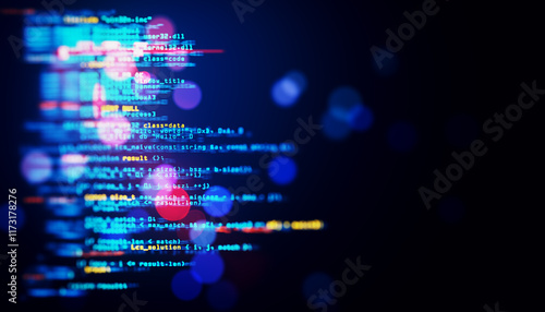 Abstract coding background with colorful programming code on dark blue backdrop. 3D Rendering