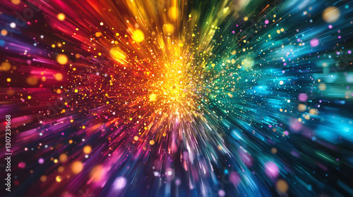 Abstract colorful burst of light rays and sparkling particles background bokeh speed shiny space