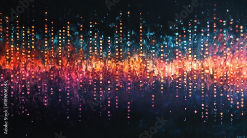 Abstract colorful light wave pattern with glowing particles on dark background.