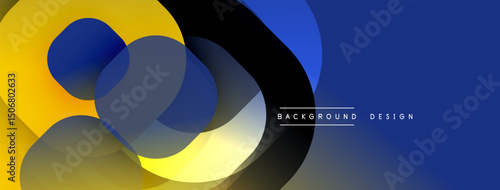 Abstract composition features overlapping circles, yellow, blue hues. Modern design with dark background, text elements present.