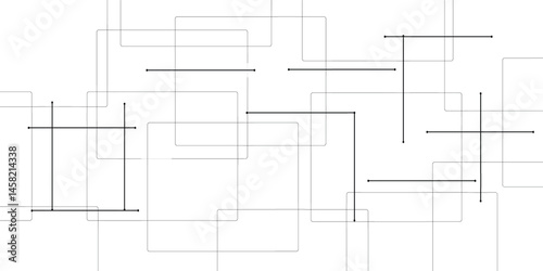 Abstract composition featuring gray rectangles black circles and intersecting lines creating a complex drawing design white background.