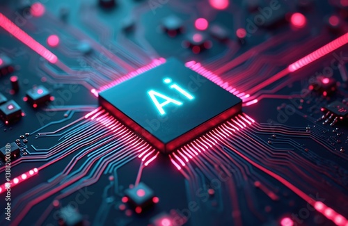 Abstract computer circuit design with neon lighting. Technology circuit cyberspace design features AI chip, digital data streams, connection, future tech. Circuit board with electronic components.