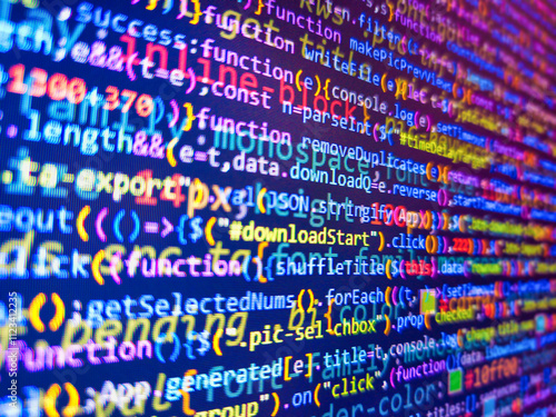 Abstract computer script code. Colorful code background. Software source code. Compressed javascript code on computer screen. Abstract background for search job. Virtual realtiy. Coding concept.