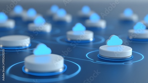 Abstract Concept of Cloud Computing with Floating Cloud Icons on Digital Network Background