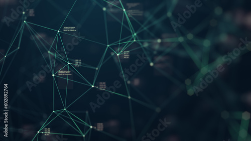 Abstract connected dots and lines. Concept of AI technology, Motion of digital data flow. Communication and technology network concept with moving lines and dots. 3D rendering