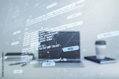 Abstract creative coding illustration on modern computer background, software development concept. Multiexposure