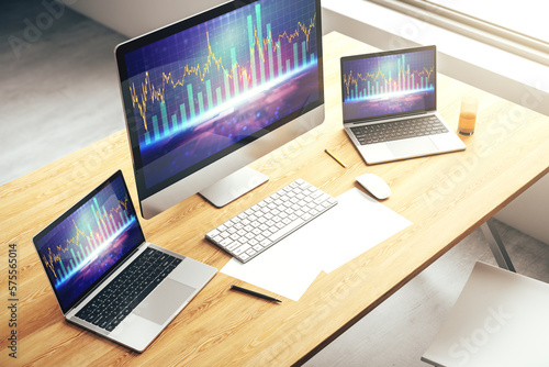 Abstract creative financial graph on modern laptop monitor, forex and investment concept. 3D Rendering