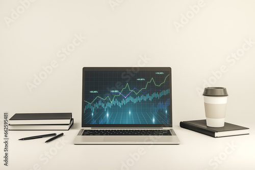 Abstract creative financial graph on modern laptop screen, forex and investment concept. 3D Rendering