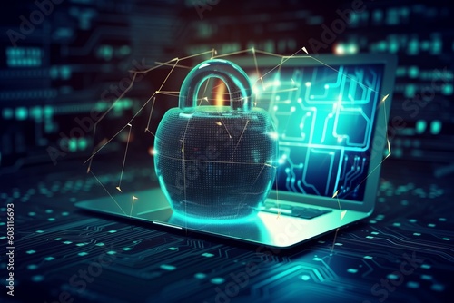 Abstract Cybersecurity Concept: Shield with Lock Icon on Circuit Board and Network Wireframe with Binary Code, Generative AI.