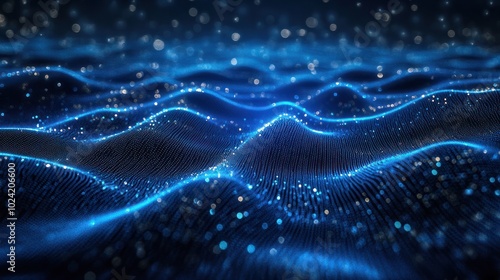 Abstract dark blue digital background with sparkling blue light particles and areas with deep depths Particles form into lines, surfaces and grids