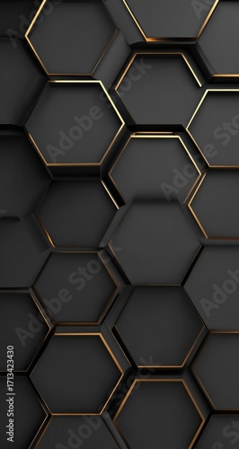 Abstract dark grey hexagonal pattern with thin gold outlining, creating a three-dimensional, textured effect. Slight depth variation adds visual interest