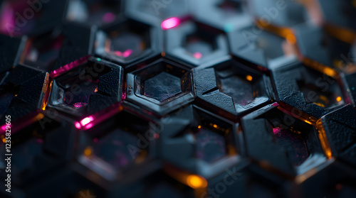 Abstract Dark Hexagon Pattern Background 3D Render Futuristic Technology Design Glowing Pink and Orange Lights Cyberpunk Style