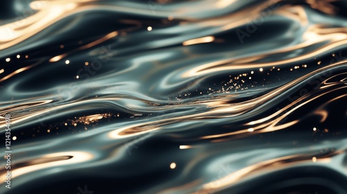 Abstract Dark Liquid with Gold Glitter and Light Reflections