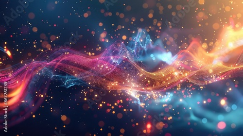 Abstract data cloud with colorful particles and light streaks.