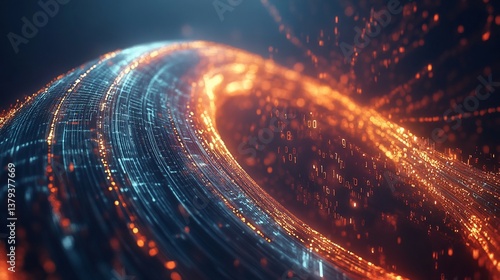Abstract data stream visualization with glowing orange and blue binary code trail