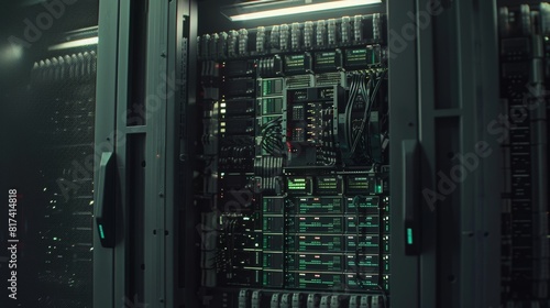 Abstract data visualization of an office server room with digital charts and graphs on the screen, representing business technology and financial equipment.