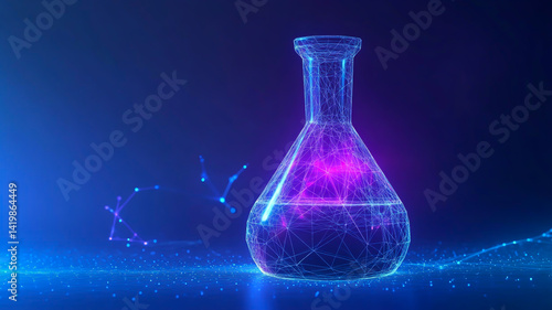 Abstract depiction of a science laboratory flask, in a low-poly style on a blue background, vector illustration concept design with a polygon mesh line structure. Glowing effect. Low-poly wireframe