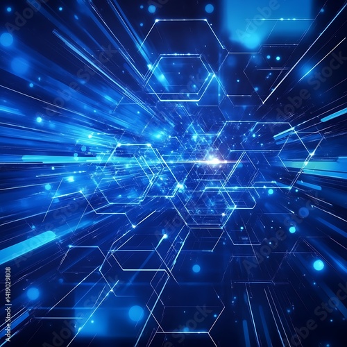 Abstract digital art depicting a dynamic, blue toned, three dimensional space filled with glowing lines, hexagons, and particles. The image creates a sense of speed and movement through the use of
