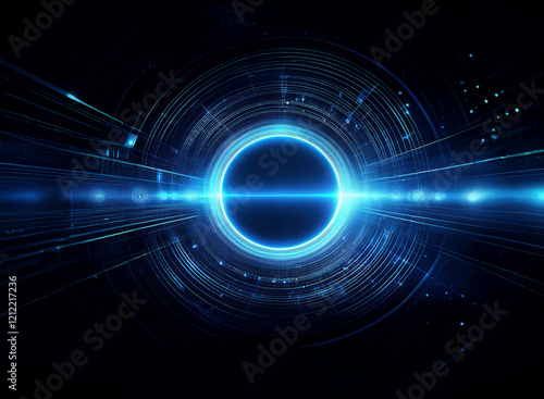 Abstract digital art depicting a glowing blue circular portal surrounded by concentric rings and streaks of light against a dark background, suggesting futuristic technology or a wormhole.