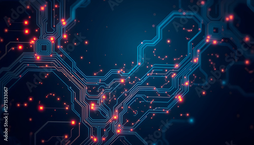 Abstract digital artwork with interconnecting lines resembling a circuit board and glowing orbs representing nodes of activity, technology background