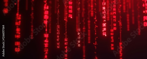 Abstract digital background featuring cascading red code strings. Ideal for tech, cybersecurity, and futuristic concepts.