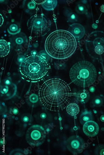 Abstract digital background featuring luminous green circles and interconnected grid patterns representing technology, data, and innovation in a visually striking design.
