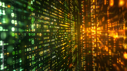 Abstract digital background with flowing binary code and glowing lights representing data processing