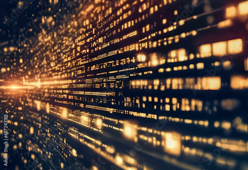 Abstract digital background with glowing binary code and light effects, representing data processing or cyber technology.
