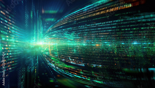 Abstract digital background with glowing binary code and lines of light
