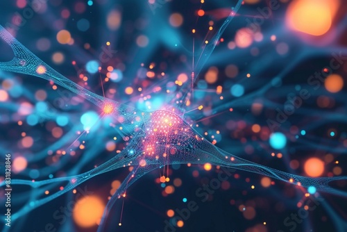 Abstract digital background with glowing data connections and neural networks, creating an atmosphere of futuristic technology and innovation. The colors include vibrant shades like reds, blues