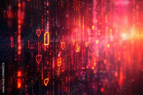 Abstract digital background with glowing icons and binary code.