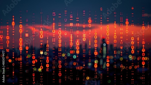 Abstract digital binary code matrix pattern overlaying cityscape at sunset, representing technology and big data concepts.