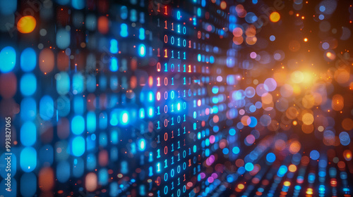 Abstract Digital Binary Code with Vibrant Lights and Bokeh..