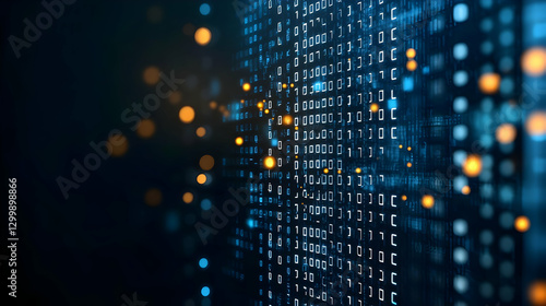 Abstract Digital Blue Grid with Glowing Orange Lights and Binary Code on a Dark Background
