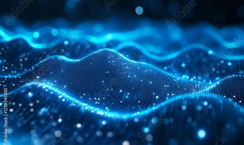 Abstract digital blue landscape with flowing particles, representing data and technology