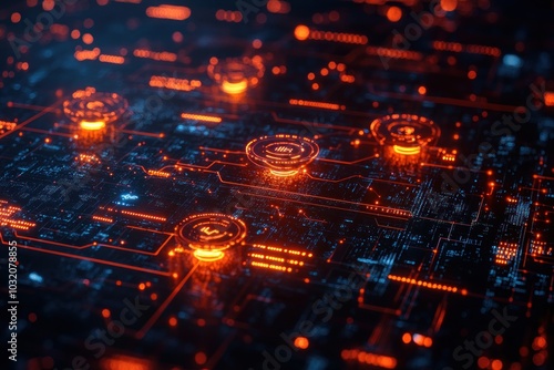 Abstract digital circuit board with glowing orange and blue lights.