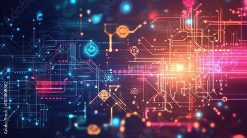 Abstract digital circuit design with vibrant colors and glowing elements.