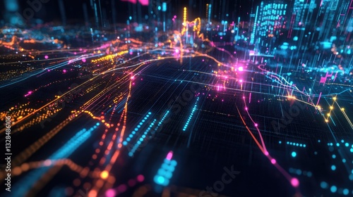 Abstract Digital Cityscape: Neon Lights and Data Streams