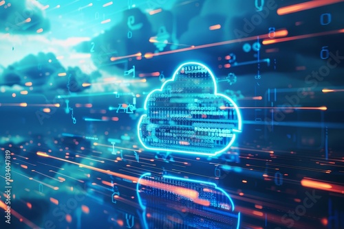 Abstract digital cloud computing concept with glowing data streams.