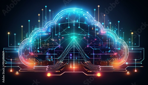 Abstract digital cloud computing network with glowing lines and icons.