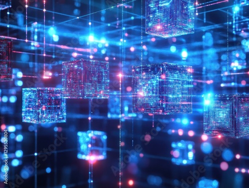Abstract digital cubes floating in a vibrant, futuristic network of light and data streams