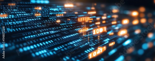 Abstract digital data background with interconnected binary code patterns, futuristic network structure, and glowing technology elements representing information flow and data analytics